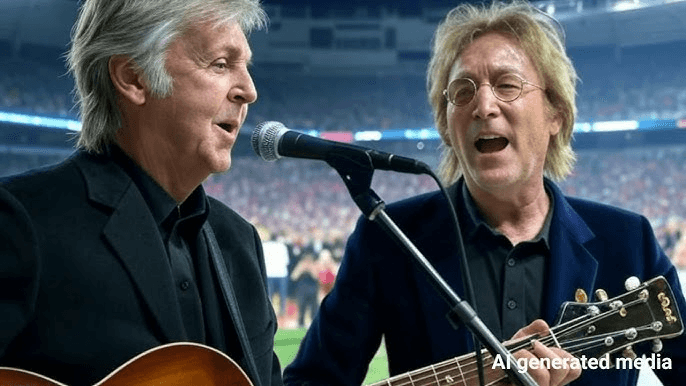 These two sons of song, once bound in brotherhood and then divided by time and fate most cruel, stood as phantoms rendered lifelike by this digital alchemy. Sir Paul, silvered by the winters of age, shone in the light, while John, ever mischievous, bore again that smile which once melted the hearts of nations. For a breath of time, the veil of sixty years was lifted, and history did bend its course.