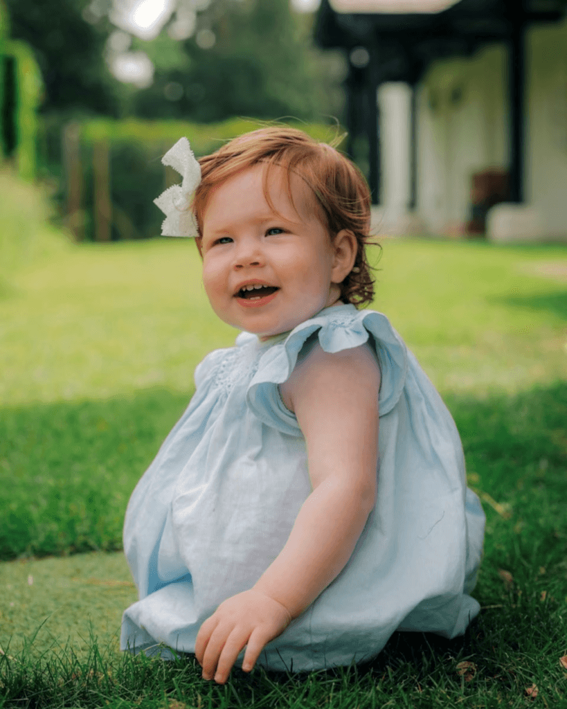 The child, clad in raiment of soft cream and clutching a small hare of cloth, gazed with innocent eyes toward the world. But lo! It was her hair that set tongues ablaze across the kingdom—locks of bright and fiery red, echoing the crown of flame borne by her father, Prince Harry, Duke of Sussex.