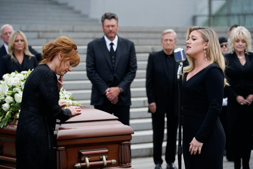 As pallbearers prepared to carry the casket inside, Kelly Clarkson stood still at the foot of the church steps. Her hands trembled around the microphone. Red-rimmed eyes glanced toward her two children, River Rose and Remington Alexander, before she softly said, “Let me sing him a song… to comfort my children, and my mother too.”