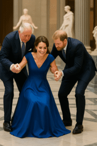 In an instant, both King Charles and Prince Harry moved toward Kate, helping her back to her feet with gentle hands and genuine concern. Their synchronized reaction, filled with warmth and care, drew audible gasps from the audience — not just for the act itself, but for what it symbolized.