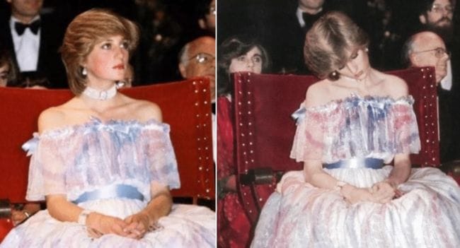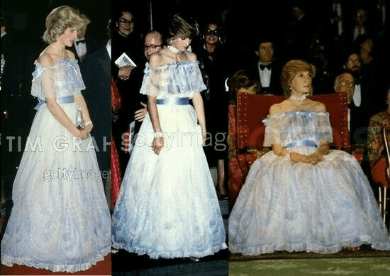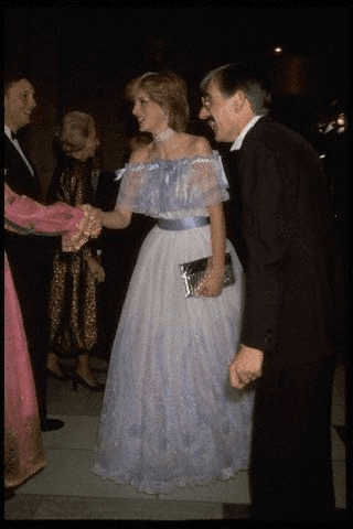 One of the most famous reminders of this came on November 4, 1981, at the Splendours of the Gonzaga exhibition gala at London’s Victoria and Albert Museum. Newly married to Prince Charles, Diana arrived in a flowing pale blue chiffon gown by Bellville Sassoon. Cameras flashed, fans cheered — and then, in an unforgettable moment, the young princess closed her eyes and appeared to drift off.