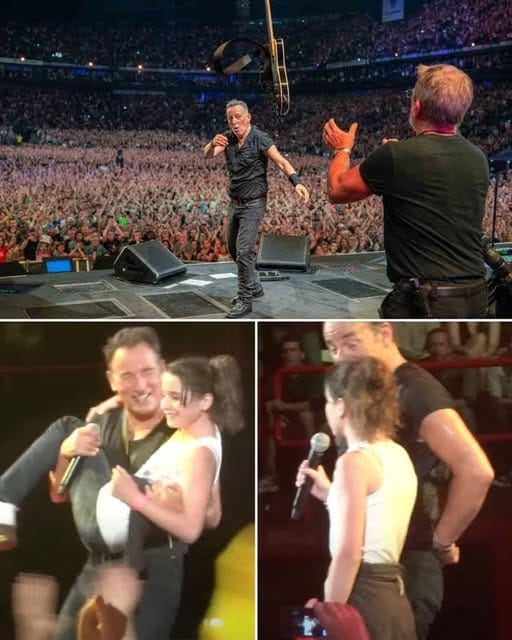 During his uplifting anthem “Waiting on a Sunny Day”, the atmosphere was already electric as fans sang every word. But what happened next turned the concert into something truly unforgettable. Spotting a young girl in the crowd, Bruce invited her on stage. With a smile that lit up the entire arena, she joined him in singing the chorus—her voice pure, her joy undeniable.