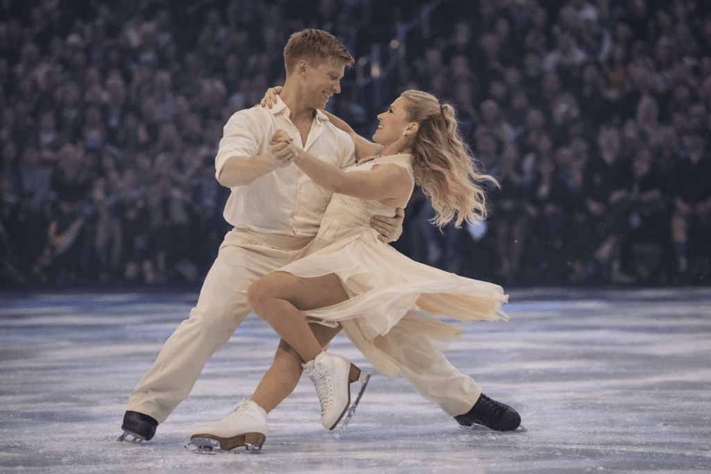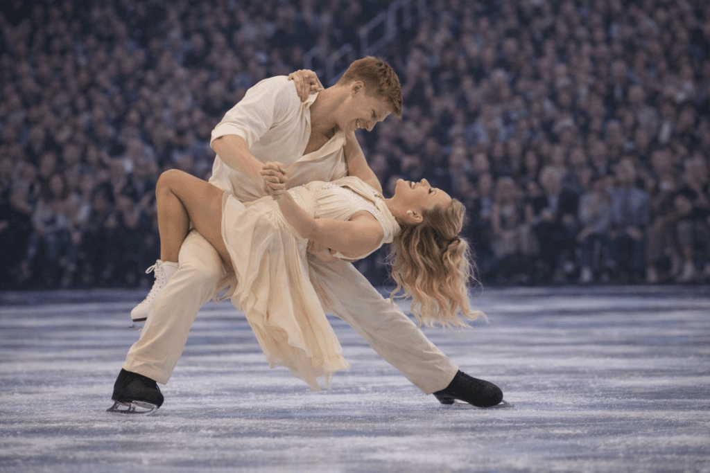 As the orchestra swells, strings layered with drama and urgency, the routine begins to breathe. Razor-sharp footwork slices through the air, sudden stops heighten the suspense, and the chemistry between the two dancers feels deliberate, controlled, and almost dangerous in its intensity.
