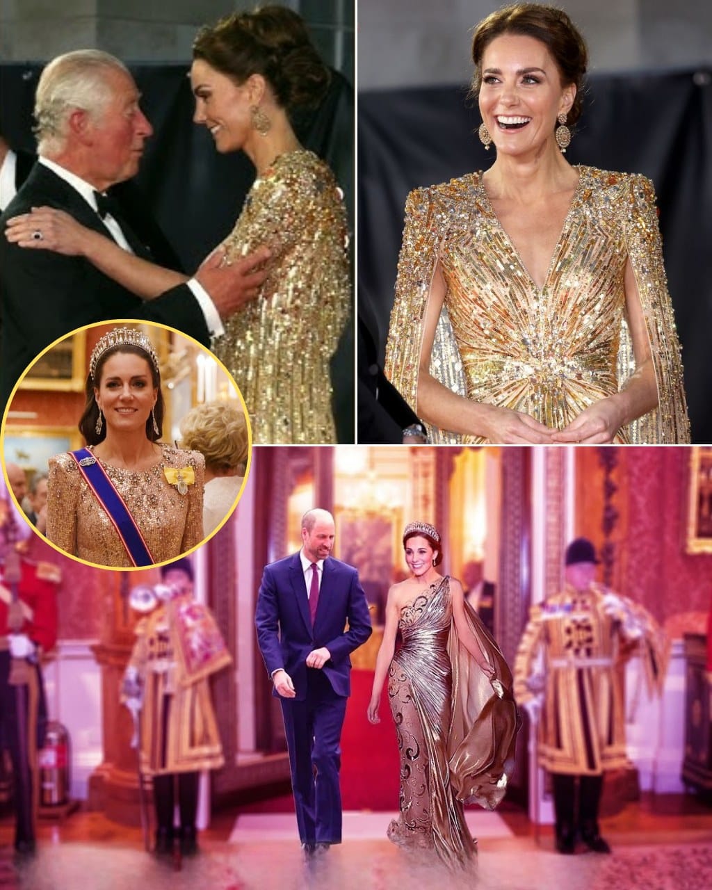 The opulent hall, draped in chandeliers and marble statuary, was already awash with diplomatic pageantry. But it was Catherine’s appearance that truly stole the night. Clad in a radiant gold gown paired with heirloom jewels once worn by the late Queen, she moved into the room like living elegance—prompting whispers of admiration from dignitaries, ambassadors, and seasoned courtiers alike.