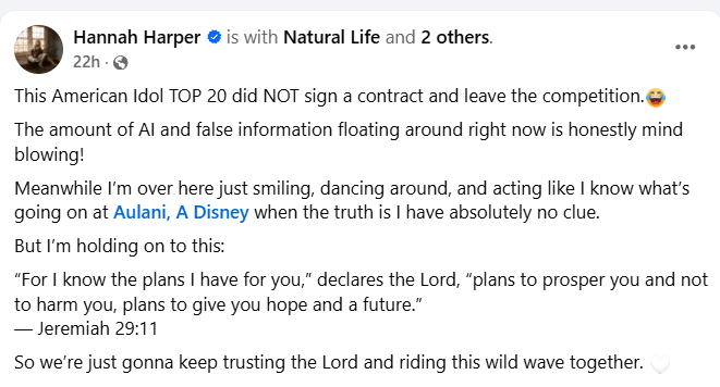 In her message, Hannah firmly denied the rumors while also bringing a sense of humor to the situation. She wrote, “This American Idol TOP 20 did NOT sign a contract and leave the competition. 😂 The amount of AI and false information floating around right now is honestly mind blowing!”