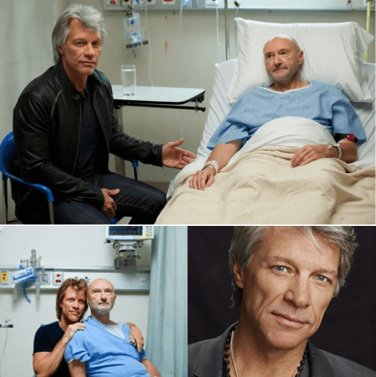 Jon Bon Jovi, armed not with a band or a spotlight but with a well-worn acoustic guitar, stepped softly into the room of his dear friend Phil Collins — who now lay frail and silent, his body weary from months of battling spinal and heart complications. The gravity of the moment was unmistakable. What followed was not a performance, but a prayer.