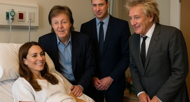 Within the private chambers of the infirmary, where the air already bore the weight of whispered prayers, two figures of musical renown appeared. Sir Paul McCartney, clad simply in a navy jacket, carrying a guitar worn by years of wandering and song, entered without heralds. Close behind came Sir Rod Stewart, hair tamed beneath a cap, his presence understated yet commanding in its sincerity. They came not as performers, but as friends.