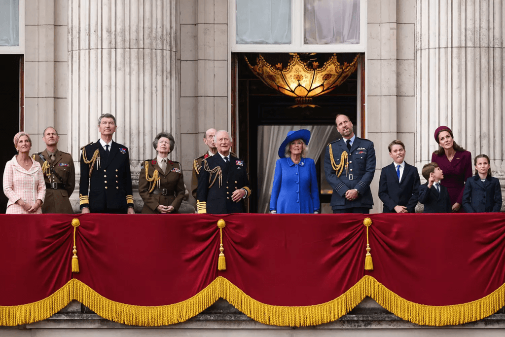 The gathering beheld the martial procession and the soaring of the King’s aeronautical host, the Red Arrows, who did paint the heavens with red, white, and blue in tribute to valor past. The multitude watched in reverence, yet their gaze was oft drawn to the tender bond of mother and child. For lo, Princess Charlotte turned to her mother, the fair Catherine, and with sweet voice declared her love, saying, “Mother, I love thee.”