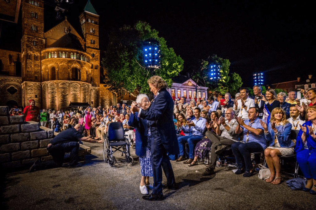 At 105 years old, André Rieu’s beloved Leona did not step onto the stage — she seemed to float toward it, carried by memory, music, and something far stronger than age. When André’s violin released the first tender notes of the waltz, the hall fell into complete silence. Not a whisper. Not a breath.