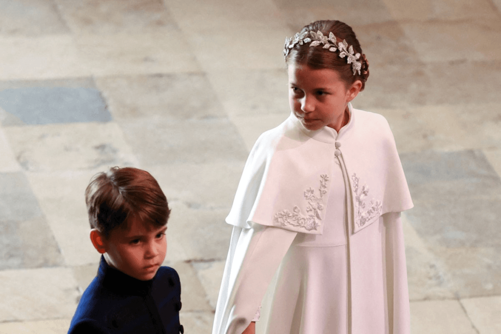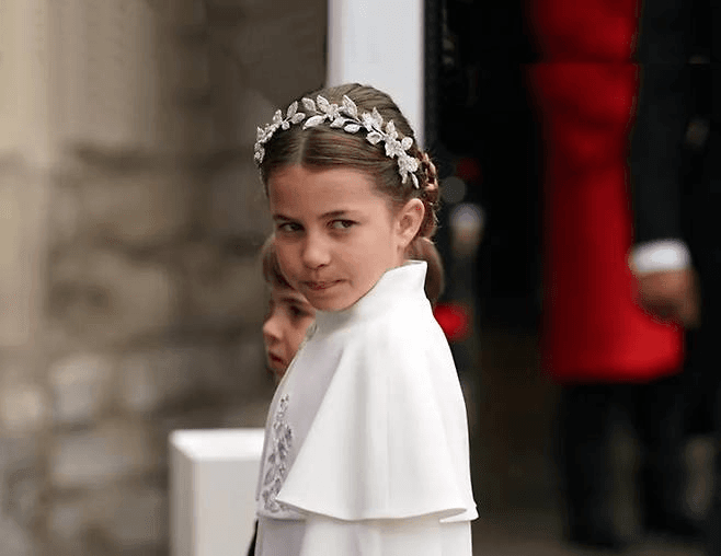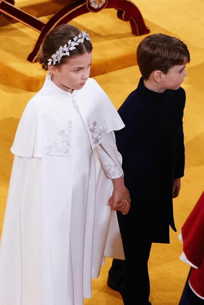 Despite their young ages—Prince Louis is seven, and Princess Charlotte is ten—they both won hearts during the coronation, even though their roles were less formal compared to Prince George’s. Princess Charlotte, in particular, caught the eye of many royal enthusiasts with her exquisite outfit, which included a headpiece that matched her mother Kate’s silver bullion and crystal flower crown, designed by Jess Collett and Alexander McQueen.