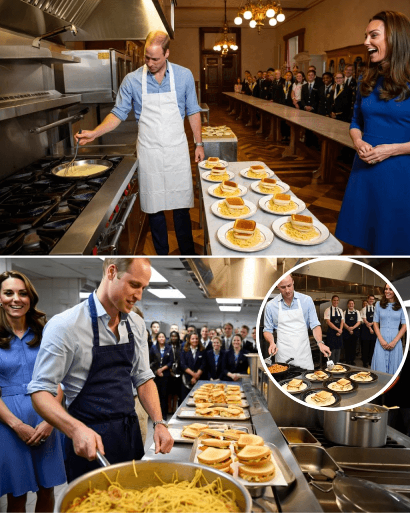 That evening, William entered the palace kitchen wearing an apron that reportedly read “Kiss the Cook.” What followed looked less like a royal banquet and more like an episode of Kitchen Nightmares.