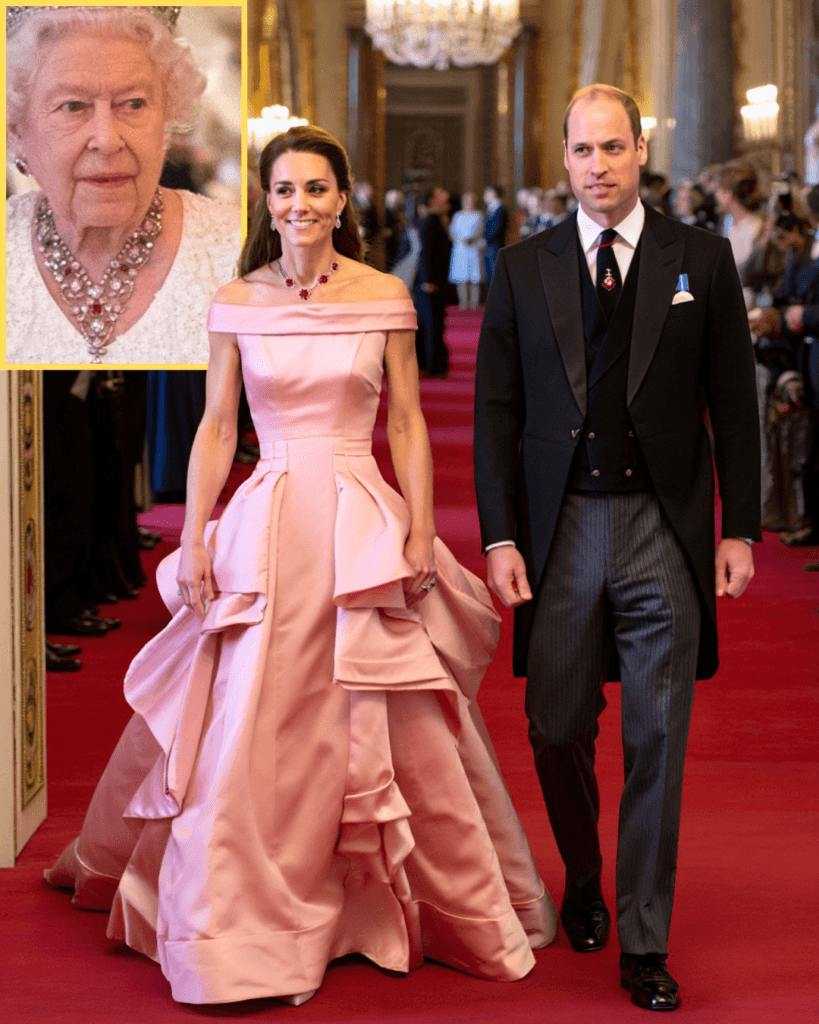 The centerpiece of Catherine’s ensemble was the exquisite Greville Ruby and Diamond Floral Bandeau Necklace—a breathtaking heirloom from the Royal Family’s private collection. Adorned with vivid crimson rubies and brilliant diamonds in an elegant floral motif, the necklace is a rare jewel not often seen in public.