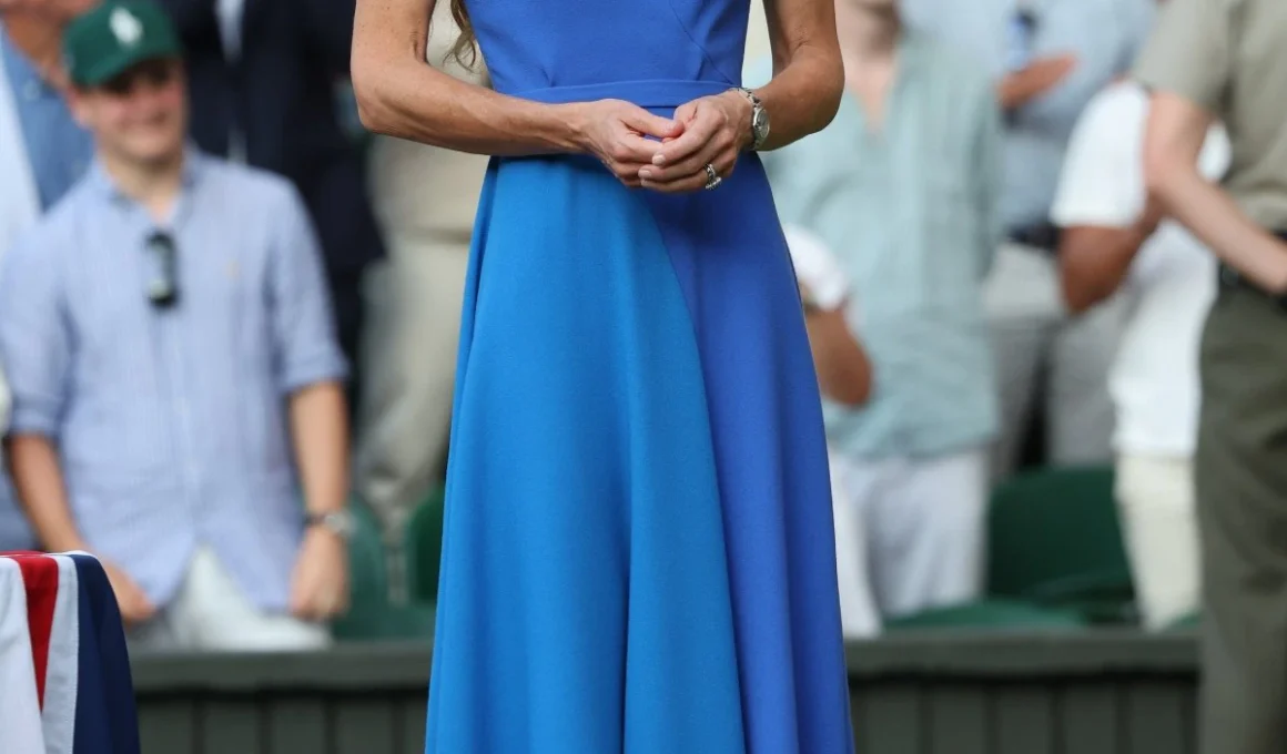 Stepping into the grand hall in a custom Alexander McQueen gown of icy blue, Catherine embodied elegance. The mermaid silhouette with a sweetheart neckline and delicate cap sleeves moved like a dream, its shimmering fabric capturing every glint of light. Fashion critics praised the design as “understated elegance, bold yet graceful,” echoing Catherine’s ability to fuse tradition with modern flair.