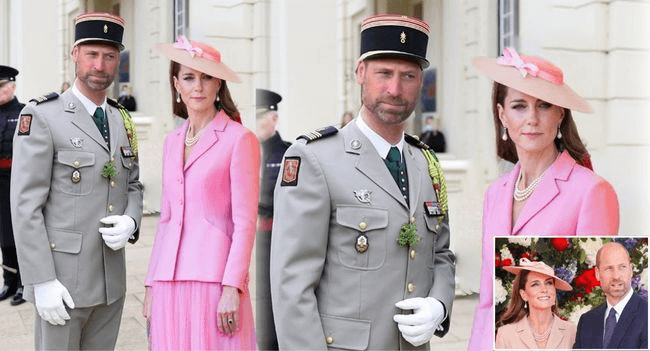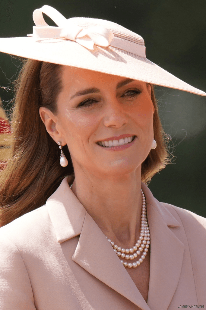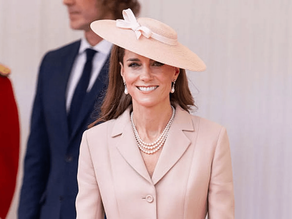 At the state visit of French President Emmanuel Macron and his wife Brigitte, Catherine once again demonstrated her flair for sartorial storytelling. For the daytime welcome on 8 July, she chose a blush-pink Christian Dior ensemble—a rare nod to French haute couture. The tailored wool-and-silk bar jacket paid homage to Dior’s iconic 1947 New Look, freshly reimagined by creative director Maria Grazia Chiuri. The flowing ballerina-length skirt brought an ethereal lightness, softly echoing the day’s diplomatic warmth.