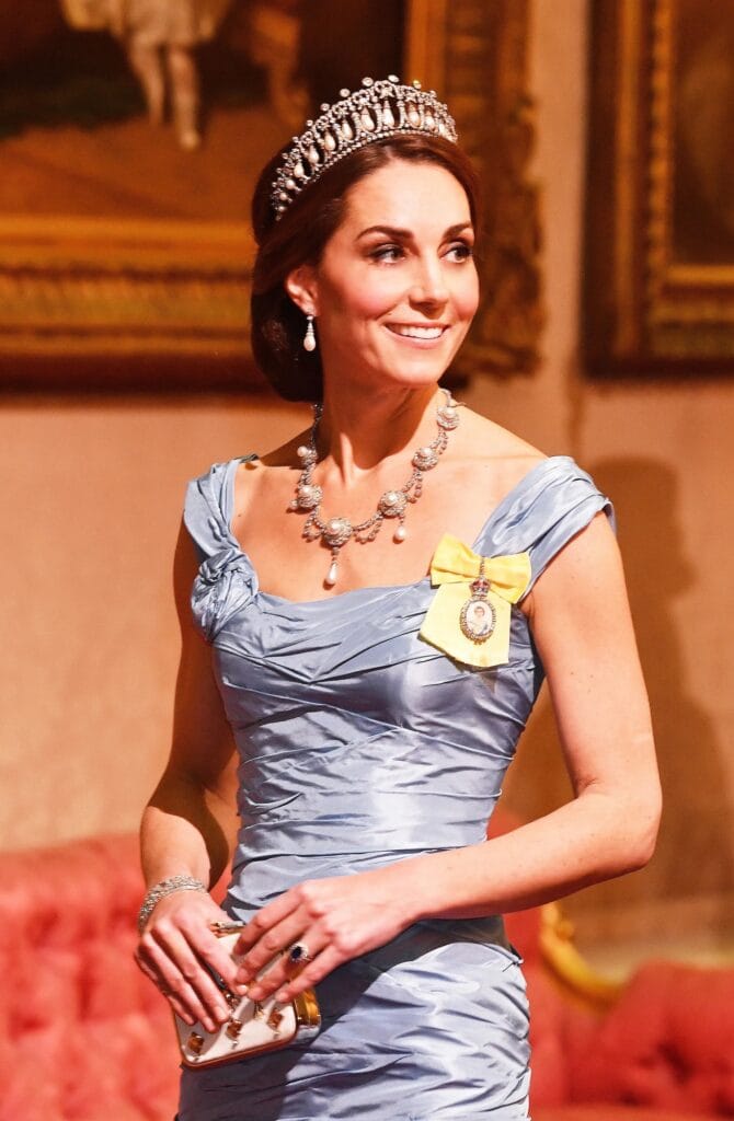 Yet even the breathtaking gown could not eclipse the jewel that rested against her collarbone. For the first time since Queen Elizabeth II’s passing, her iconic diamond-and-sapphire necklace reappeared — and it did so on Catherine. Royal insiders confirmed the piece had been kept locked away in the Royal Vaults, never worn by another member of the family until now. Its reemergence, many believe, was deliberate. “This wasn’t just jewelry,” said one palace insider. “It was a message: Catherine is not preparing to be Queen — she already embodies it.”