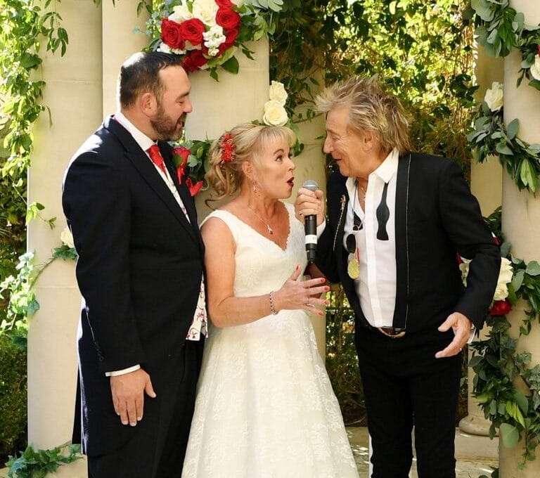 As Andrew and Sharon exchanged vows at Caesars Palace, surrounded by family and friends, they had no idea that an even bigger surprise was waiting. Moments after they said “I do,” none other than Sir Rod Stewart appeared—microphone in hand, smile on his face.