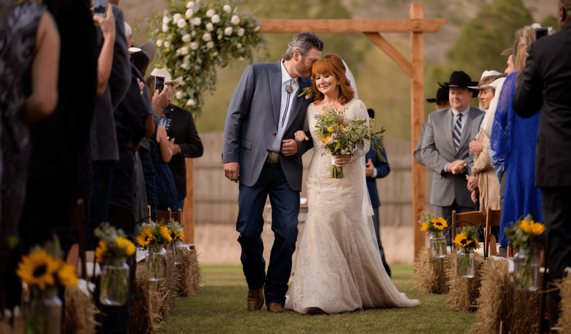 But it was Blake Shelton who delivered one of the most emotional moments of the day. A longtime friend and mentee of Reba, he walked her down the aisle in a slate-gray cowboy tux, tears in his eyes. Leaning in before handing her over to Rex, he was overheard saying, “You’re not losing yourself today. You’re gaining someone who already worships the ground you sing on.”