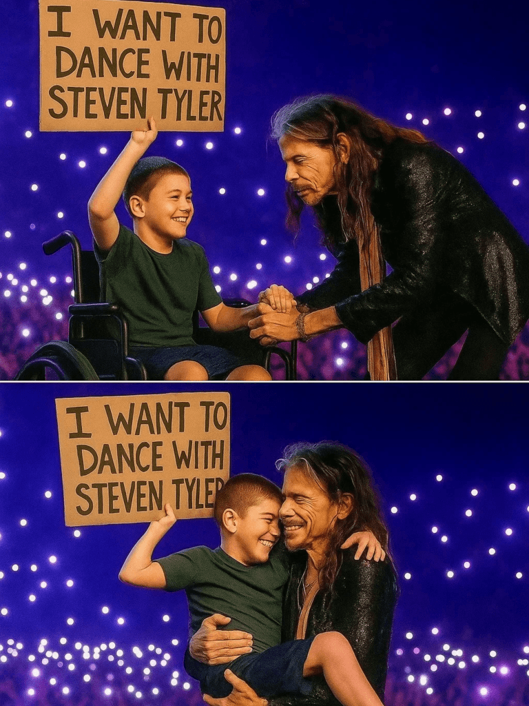 Near the barricade, tucked among a sea of fans waving phones in the air, sat a young boy in a wheelchair. Frail but radiant, he held no camera, no merch. Just a simple, hand-painted sign: “I Want to Dance With Steven Tyler.”