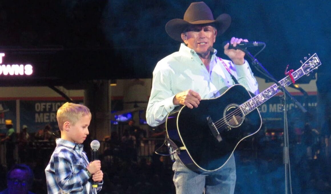 Out walked 8-year-old Harvey Strait—grandson of the King of Country himself, George Strait. Dwarfed by the stage, his boots a little too big, Harvey clutched the microphone with both hands, wide-eyed and trembling.