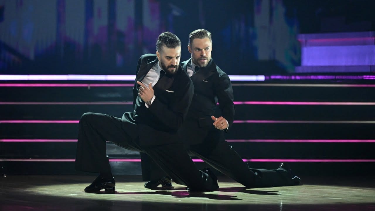 Derek’s opening steps were sharp, commanding, and filled with the intensity that’s made him a legend of the ballroom. Every flick of his wrist and every twist of his body drew the audience in closer. His eyes burned with focus — until, suddenly, the lights shifted to red, and the music took an unexpected turn. A second shadow appeared from the wings.